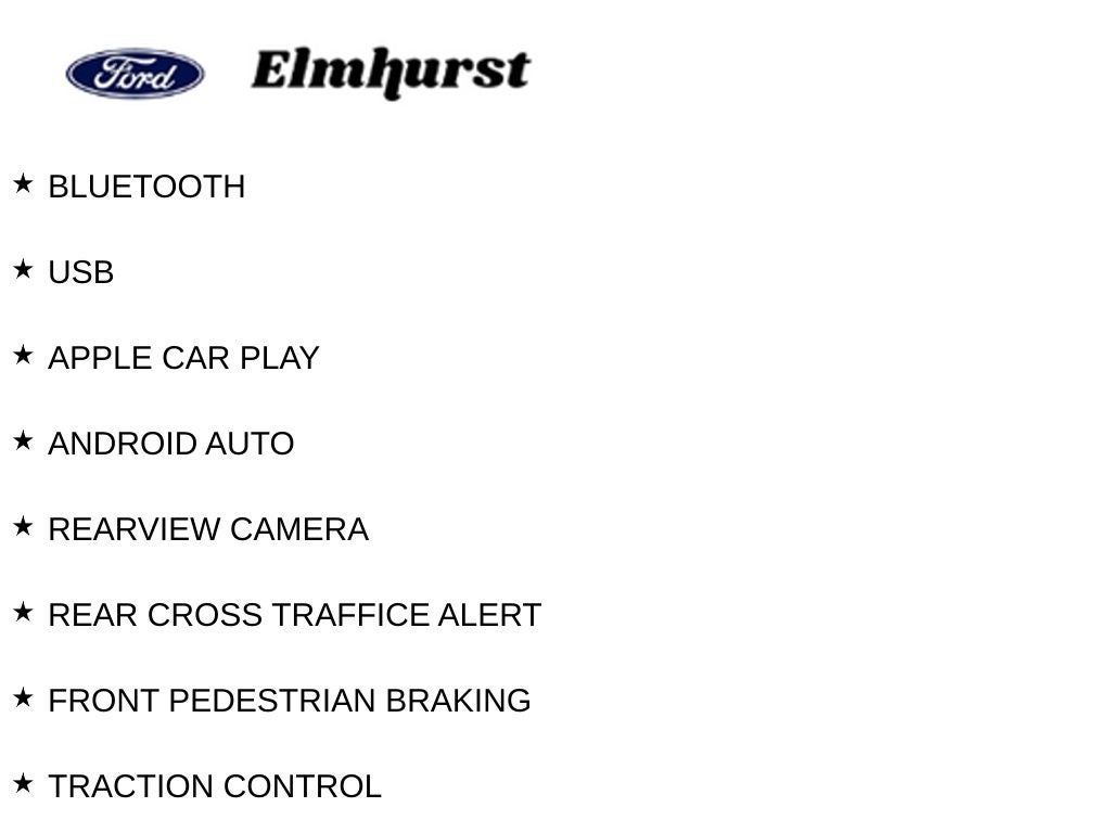 Bluetooth®, USB, APPLE CAR PLAY, ANDROID AUTO, REARVIEW CAMERA, REAR CROSS TRAFFICE ALERT, FRONT PEDESTRIAN BRAKING, TRACTION CONTROL, REMOTE START, ALLOY WHEELS.