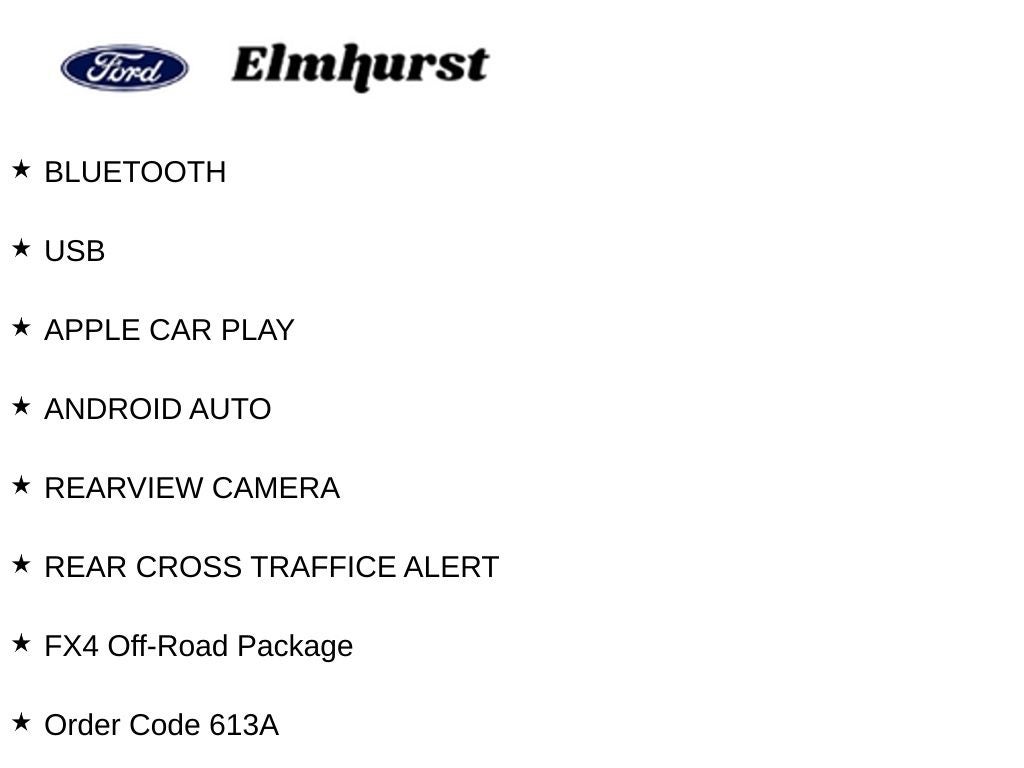 Bluetooth®, USB, APPLE CAR PLAY, ANDROID AUTO, REARVIEW CAMERA, REAR CROSS TRAFFICE ALERT, 4WD, FX4 Off-Road Package, Hill Descent Control, Off-Road Specifically Tuned Shock Absorbers, Order Code 613A, Unique FX4 Off-Road Box Decal.